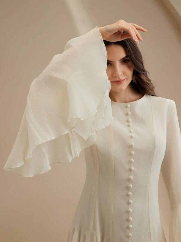 Anewsta فستان أنيق أبيض لبن أكمام طويلة قصة a مع ديكور أزرار أكمام جرس
