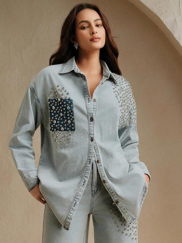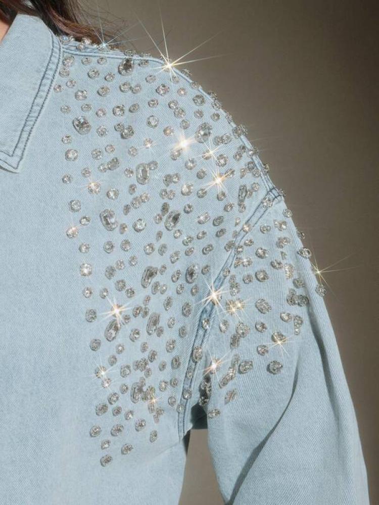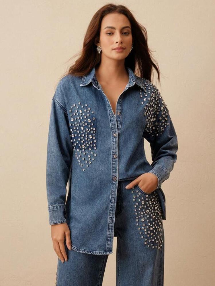 Anewsta قميص جينز مزين بدبابيس وخرز، تصميم أنيق للنساء، مناسب للربيع، العطلات، ارتداء يومي، المهرجانات، الإجازات